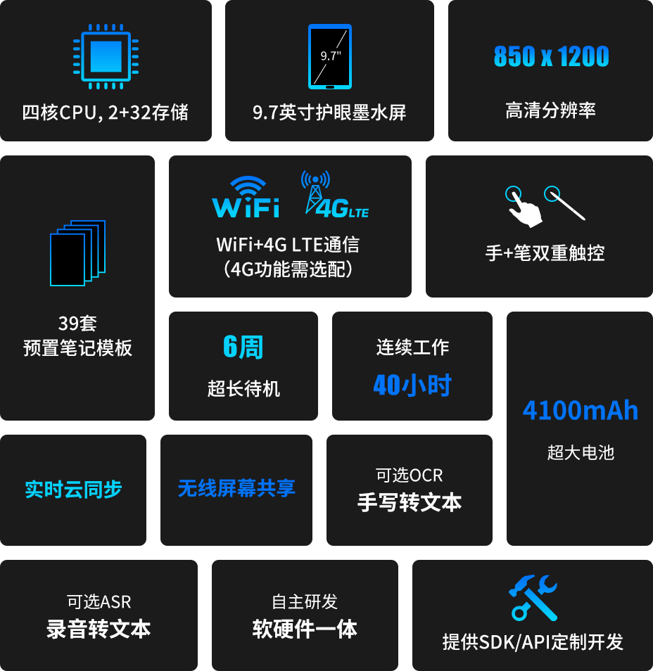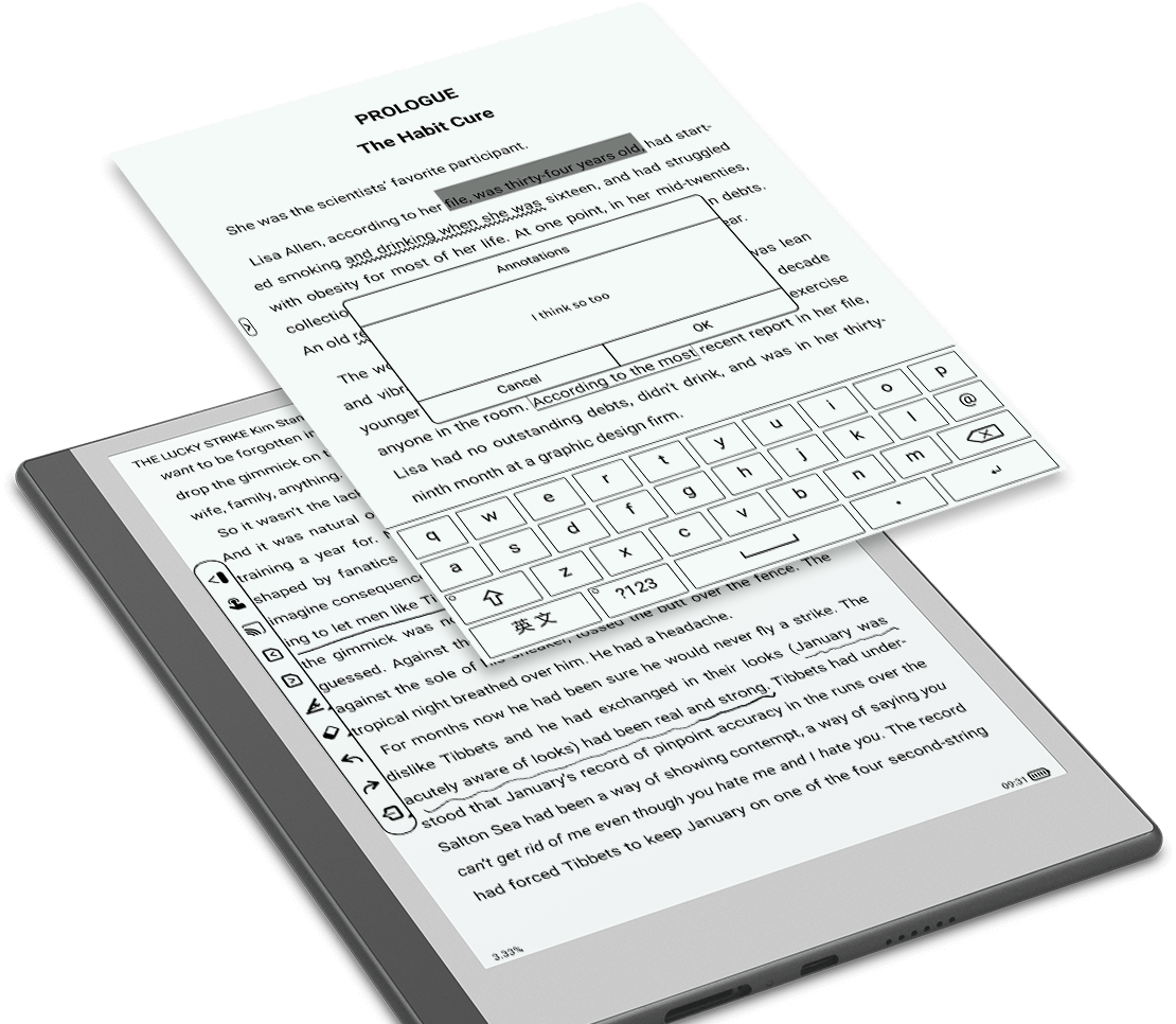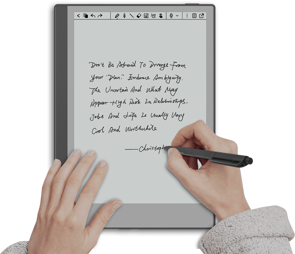 类纸笔般的阅读、书写体验,无频闪,无惧强光,长时间使用有效呵护双眼,预置多套笔记模板,记录更加得心应手,