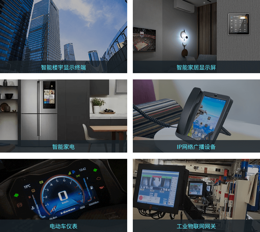 广泛适用智能楼宇显示终端、智能家居显示屏、智能家电、IP网络广播设备、电动车仪表、工业物联网网关、工业HMI等各种对性能要求不高,但对成本要求苛刻应用场景。