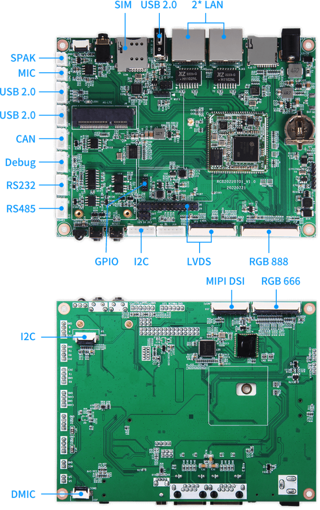 搭载UART、I2C、GPIO、USB2.0、MIPI DSI、RGB、LVDS、I2S、RGMII、RS232、RS485、CAN、音频输入输出等丰富扩展接口,支持双100M以太网、2.4G Wi-Fi和4G移动通信,为产品应用提供丰富的功能扩展。