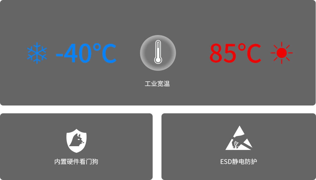 全部元器件采用工业宽温-40~85℃设计,内置看门狗、ESD静电防护,严格按照工业标准测试和生产,保障在户外严苛环境下7×24小时不间断稳定运行,满足工业应用的高质量和可靠性要求。