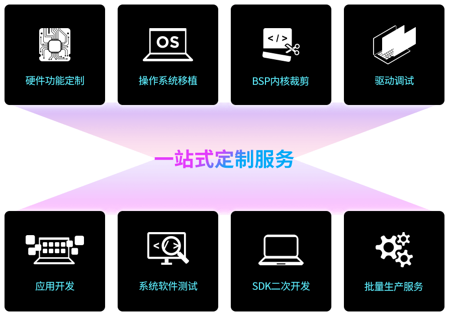 金亚太拥有26年ARM产品的技术研发沉淀和合作伙伴资源,不仅能为客户提供硬件功能定制设计,还能提供跨SOC平台的操作系统移植、BSP内核裁剪及驱动调试、基于场景的应用软件开发、整体的系统软件测试服务、完善的SDK二次开发接口等一站式顾问服务,借助公司自有近3万㎡生产工厂,帮助客户极大缩短从产品选型、研发立项、小量试产到量产交货的周期。