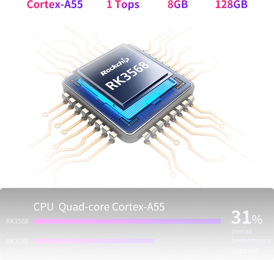 | NPU | 1 Tops@INT8, integrated high-performance AI accelerator RKNN NPU Supports one-click switching of Caffe / TensorFlow / TFLite / ONNX / PyTorch / Keras / Darknet |
