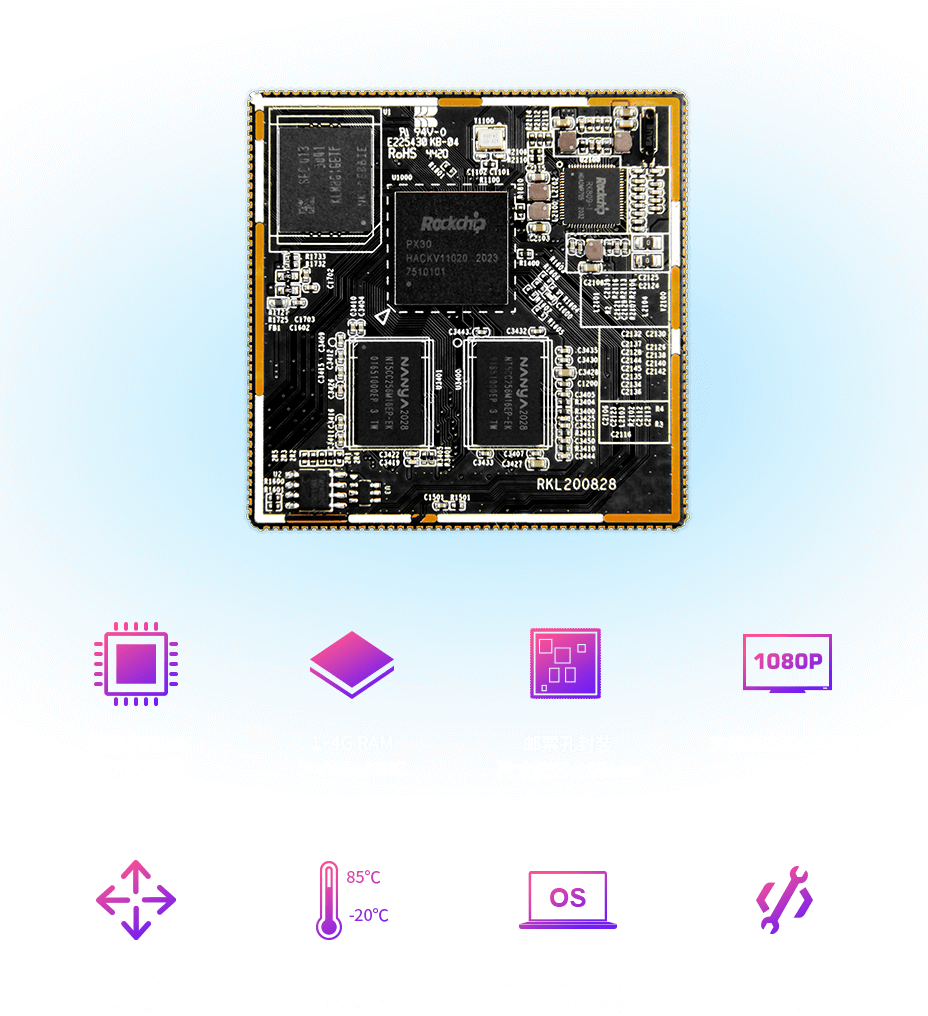 采用PX30工业级64位低功耗处理器,四核Core-A35,集成ARM Mali-G31 MP2 GPU,拥有强大的硬解码能力,可为各类行业及工业应用场景带来更优异的性能表现,赋予产品更多的想象空间。