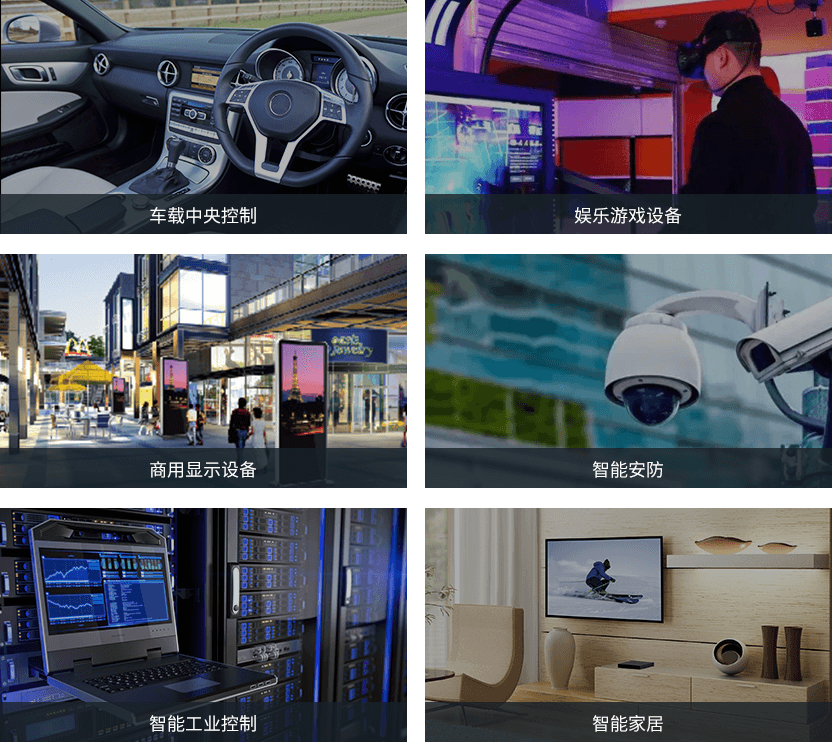 可用于物联网设备、车载中央控制、娱乐游戏设备、商用显示设备、智能安防、智能工业控制、智能家居等领域。