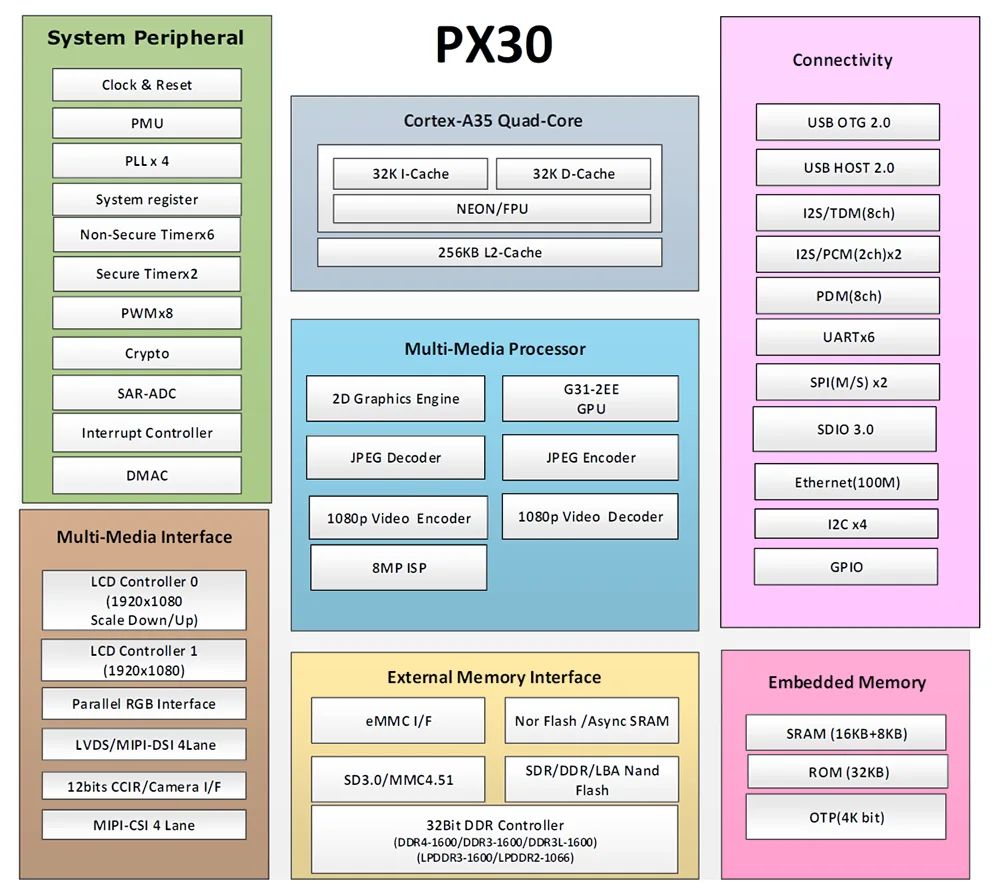 • 瑞芯微PX30四核64位A35处理器,主频高达1.3GHz,集成Mali-G31图形处理器