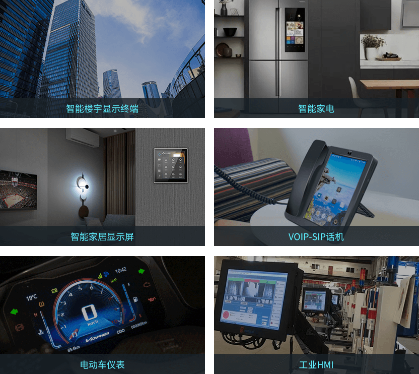 广泛适用智能楼宇显示终端、智能家电、智能家居显示屏、VOIP-SIP话机、电动车仪表、工业物联网网关、工业HMI等各种应用场景。