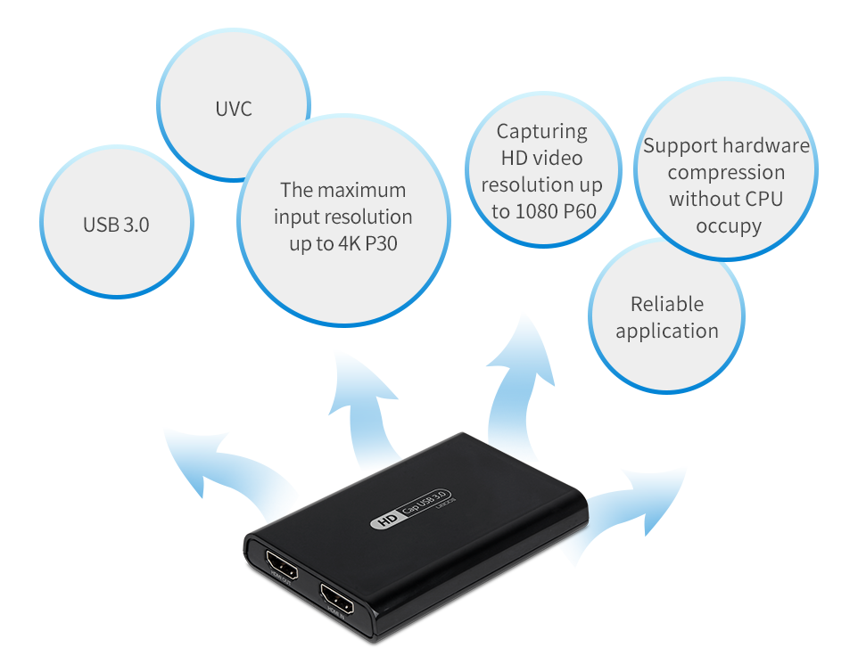 U800II is a USB3.0 hardware compression HDMI® digital video capture, input resolution up to 4K P30 MAX and capturing HD video resolution up to 1080 P60 MAX . UVC is driving-free plug and play